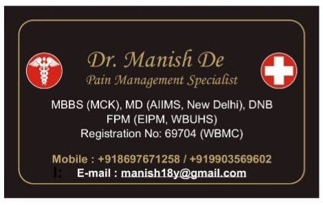 Struggling with chronic pain? Get advanced, personalised pain management from Dr. Manish De, one of Kolkata’s leading pain specialists. From knee pain, heel pain, low back pain, frozen shoulder, migraines, cancer pain to post-TKR persistent pain—Dr. De offers safe, evidence-based treatments across multiple locations: